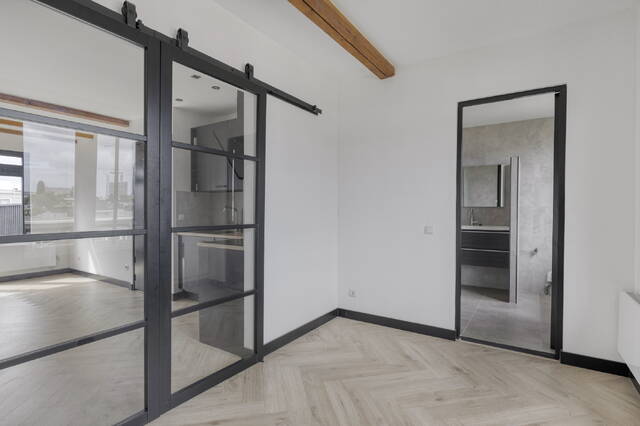 Through the French doors from the living room you step directly onto the rooftop terrace, twelve point two square metres with a west-facing orientation. That means full evening sun, right at the moment you are home after a long day. In summer this is the place for a barbecue with friends, or simply winding down with a book as the sun sets around you. The sounds of the city fade here, and you get the feeling of being completely away from it all, right in the middle of Amsterdam.