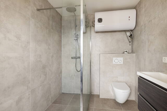The bathroom is fully and practically fitted out. You will find a walk-in shower, a toilet, a generous washbasin with illuminated mirror and space for both a washing machine and a dryer. Everything you need, arranged in a clean and practical way.