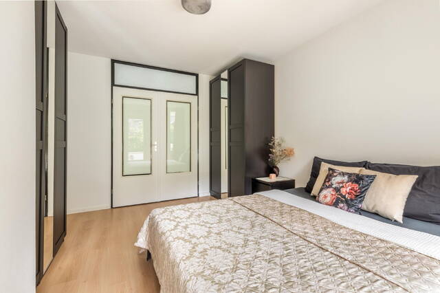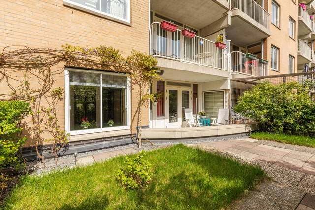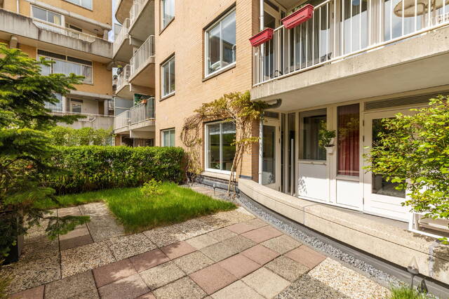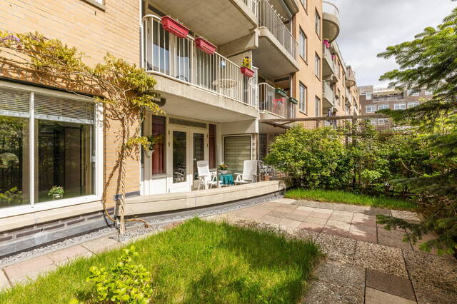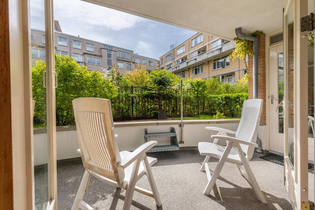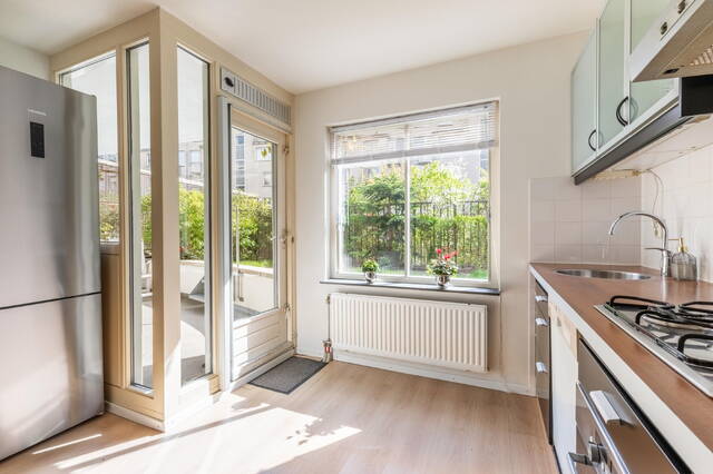 Aan de achterzijde van de woning bevinden zich de slaapkamer en de keuken. De keuken is praktisch ingericht en biedt toegang tot het balkon aan de achterzijde en de zonnige tuin op het zuiden. Een groot pluspunt is dat je hier kunt genieten van zon en privacy, wat in deze buurt bijzonder prettig is. Daarnaast beschikt het appartement over een aparte berging in de kelder van het gebouw, bereikbaar via de gezamenlijke entree.