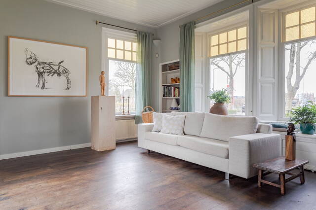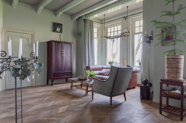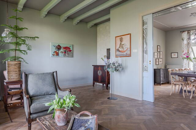 In de royale en straatgerichte zitkamer met een erker is een massief gerookte eikenhouten vloer in een zogenaamde Hongaarse punt met een sierrand gelegd, de wanden zijn gestuukt en een hoog plafond met robuuste balken siert deze ruimte. Radiatoren verwarmen de kamer en in de hoge ramen is dubbel glas geplaatst. Middels stijlvolle en-suite deuren met een geëtste raamdecoratie heeft u toegang tot de sfeervolle eetkamer met aan weerszijde vaste kasten. Ook in deze kamer is een hoog plafond met sierlijst en ornament, de visgraat vloer is hier doorgelegd en openslaande deuren geven toegang tot een deels overdekt en knus terras waar u al vroeg in het voorjaar van de zon kan genieten.