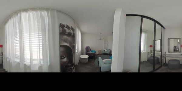 A spacious hall welcomes you with a luxurious floating toilet. The living room, extended across the full width, leads to a modern kitchen with high-quality appliances. The kitchen is expanded with a luxurious seating area with bar stools.