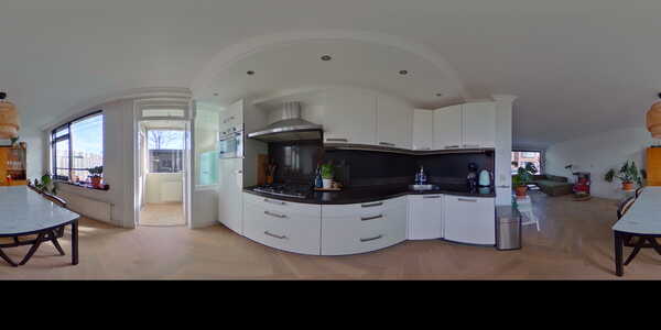 De open keuken is modern ingedeeld met glanzende witte keukenkasten en zwart granieten werkblad. Het is van alle gemakken voorzien met 4-pits gasfornuis, ruime koelkast, afzuigkap en inbouwapparatuur. Kortom, een ideale plek om lekker te kokkerellen en na te tafelen! Opbergruimte genoeg, want vanaf hier heb je ook nog toegang tot een bijkeuken.