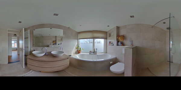 De eerste verdieping is te bereiken via de trap in de woonkamer. Hier vind je twee slaapkamers en de badkamer. Ook de badkamer is perfect onderhouden en heeft een moderne en luxe uitstraling met grote beige tegels en een houten wastafelmeubel met dubbele wastafel. Hier is het heerlijk relaxen met fijn ligbad, inloopdouche en zwevend toilet.